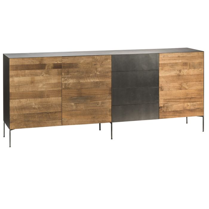 Enhance your home with this 3-door sideboard made from recycled teak, featuring 4 practical drawers. the warmth of recycled teak blends seamlessly with the sturdy metal finish, offering a style that is both elegant and industrial. with spacious doors and well-designed drawers, this sideboard provides ample storage while adding character to your home. ideal for a living room, dining area, or office, this piece combines durability with sophisticated design.